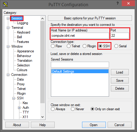 In der Kategorie Session geben Sie als Host Name den Namen der Compute-Instanz ein, auf der Sie sich verbinden möchten, z.B.: ABCXYZ-000. Die Angabe für Port lautet 22 und der Connection Type ist SSH.