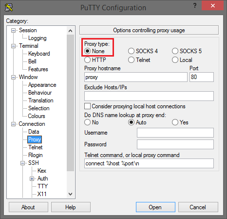 In der Kategorie Connection -> Proxy stellen Sie den Proxy type auf Local und tragen als Proxy hostname compute.idnt.net sowie Port 22 ein. In das Feld Telnet command geben Sie folgendes ein: