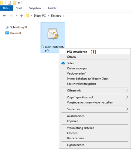 Öffnen Sie den Ordner, in dem sich Ihr Zertifikat befindet und klicken Sie mit der rechten Maustaste auf die Datei, um das sog. Kontextmenu zu öffnen. Wählen Sie [1] PFX installieren aus: