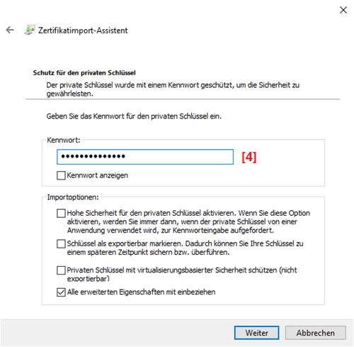 Sie werden nun aufgefordert, Ihr **[4] Kennwort **für dieses Zertifikat einzugeben. Sie haben dieses Kennwort entweder selbst vergeben (z.B. bei der Umwandlung in PKCS#12) oder es wurde Ihnen mitgeteilt. Geben Sie es ein und bestätigen mit Weiter: