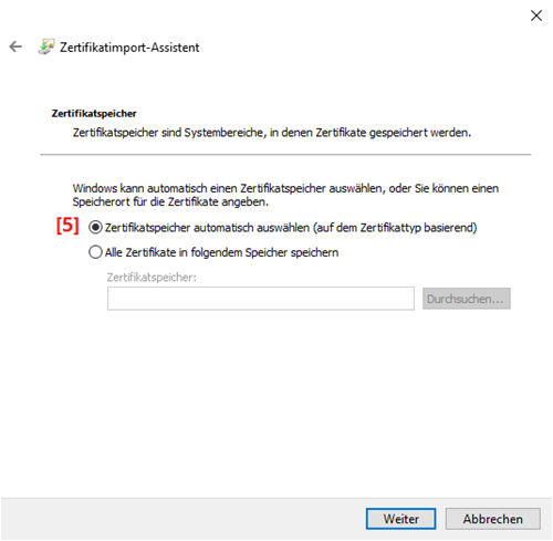Windows fragt Sie nun, ob der **[5] Zertifikatsspeicher automatisch gewählt **werden soll. Bestätigen Sie dies mit Weiter: