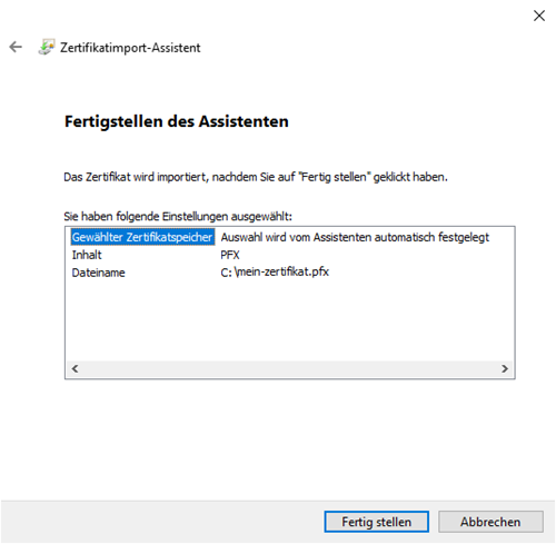 Ihr Zertifikat wurde importiert und steht nun anderen Anwendungen mit Zugriff auf diesem Speicher zur Verfügung.