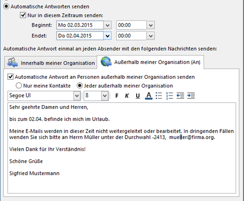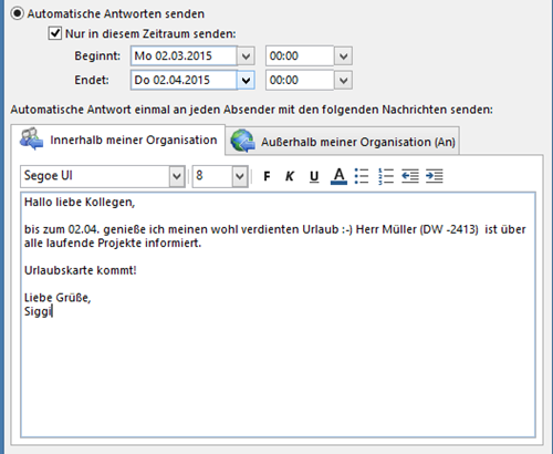 Der Text, welchen Sie unter "Innerhalb meiner Organisation" eingeben, wird ausschließlich an Absender in Ihrem Unternehmen als Antwort gesendet: