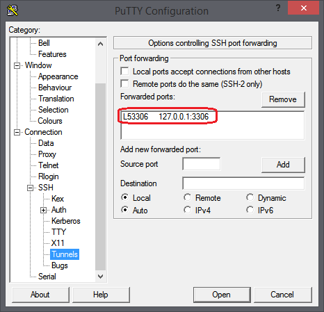 127.0.0.1:3306 - Klicken Sie auf Add, um den Tunnel hinzuzufügen