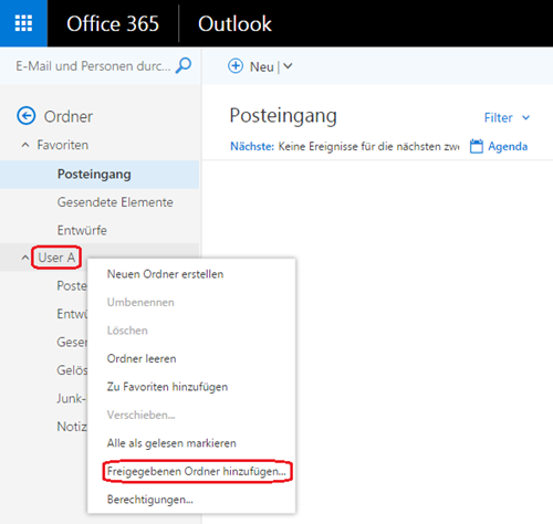 Klicken Sie im linken Navigationsbereich mit der rechten Maustaste auf Ihr Postfach. Es erscheint ein kleines Kontextmenu. Wählen Sie Freigegebenen Ordner hinzufügen aus.
