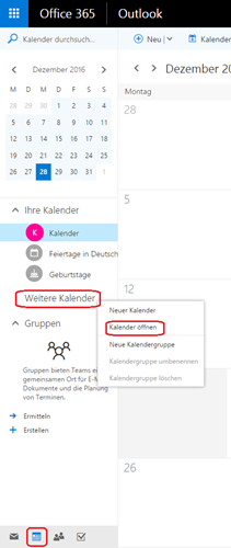 Klicken Sie mit der rechten Maustaste auf Weitere Kalender und wählen Kalender öffnen aus.