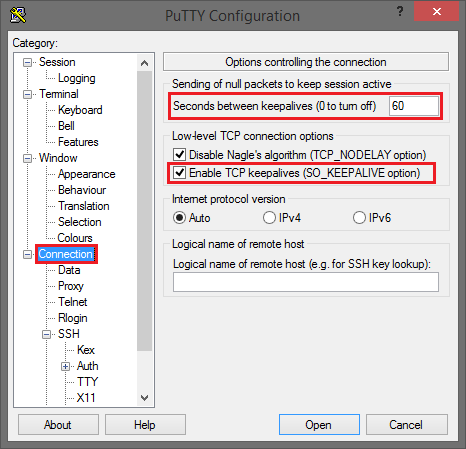 In der Kategorie Connection tragen Sie für Seconds between keepalives 60 ein und setzen ein Häkechen bei Enable TCP keepalives.