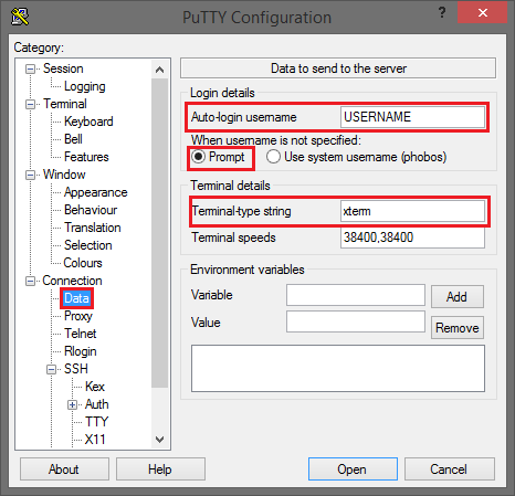 In der Kategorie Connection -> Data geben Sie Ihren IDNT Benutzernamen in das Feld Auto-login username ein. Dies ist der Benutzername, mit dem Sie sich auf die Compute Instance anmelden. Weiter wählen Sie Prompt in der Auswahl When username is not specified und geben für Terminal-type string xterm ein.