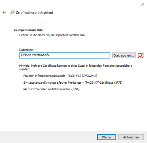 Prüfen Sie, ob der Dateiname stimmt (falls nicht, wählen Sie Ihr Zertifikat über [3] Durchsuchen aus) und bestätigen Sie mit Weiter: