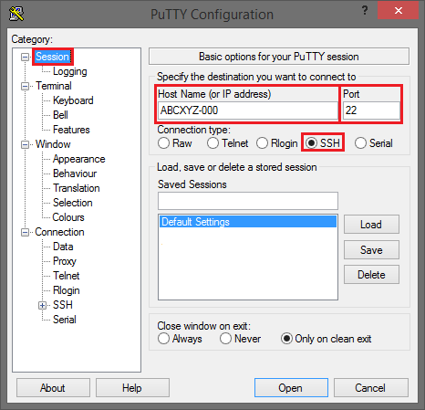 In der Kategorie Session geben Sie als Host Name den Namen der Compute-Instanz ein, auf der Sie sich verbinden möchten, z.B.: ABCXYZ-000. Die Angabe für Port lautet 22 und der Connection Type ist SSH.