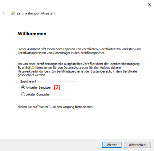 Es öffnet sich ein Import-Assistent. Wenn es sich um Ihr eigenes Benutzerzertifikat handelt, wählen Sie als Speicherort **[2] Aktueller Benutzer **aus und bestätigen Sie mit Weiter: