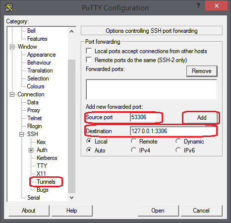 127.0.0.1:3306 - Klicken Sie auf Add, um den Tunnel hinzuzufügen
