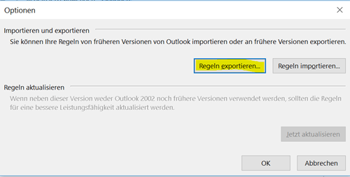Um die Regeln in einem anderen Outlook zu importieren, verfahren Sie identisch. Wählen Sie anstelle "Regeln exportieren..." dann "Regeln importieren..."