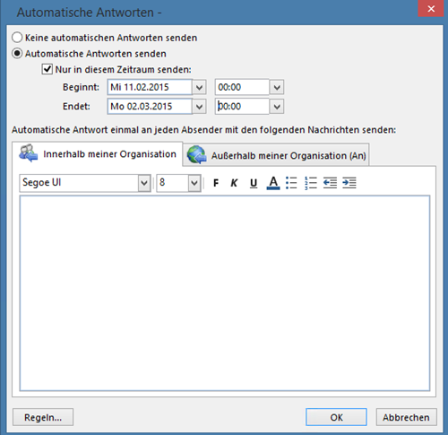 You can set different messages for internal (within your organization) and external (outside your organization) senders by using the respective tabs in the automatic replies dialog.